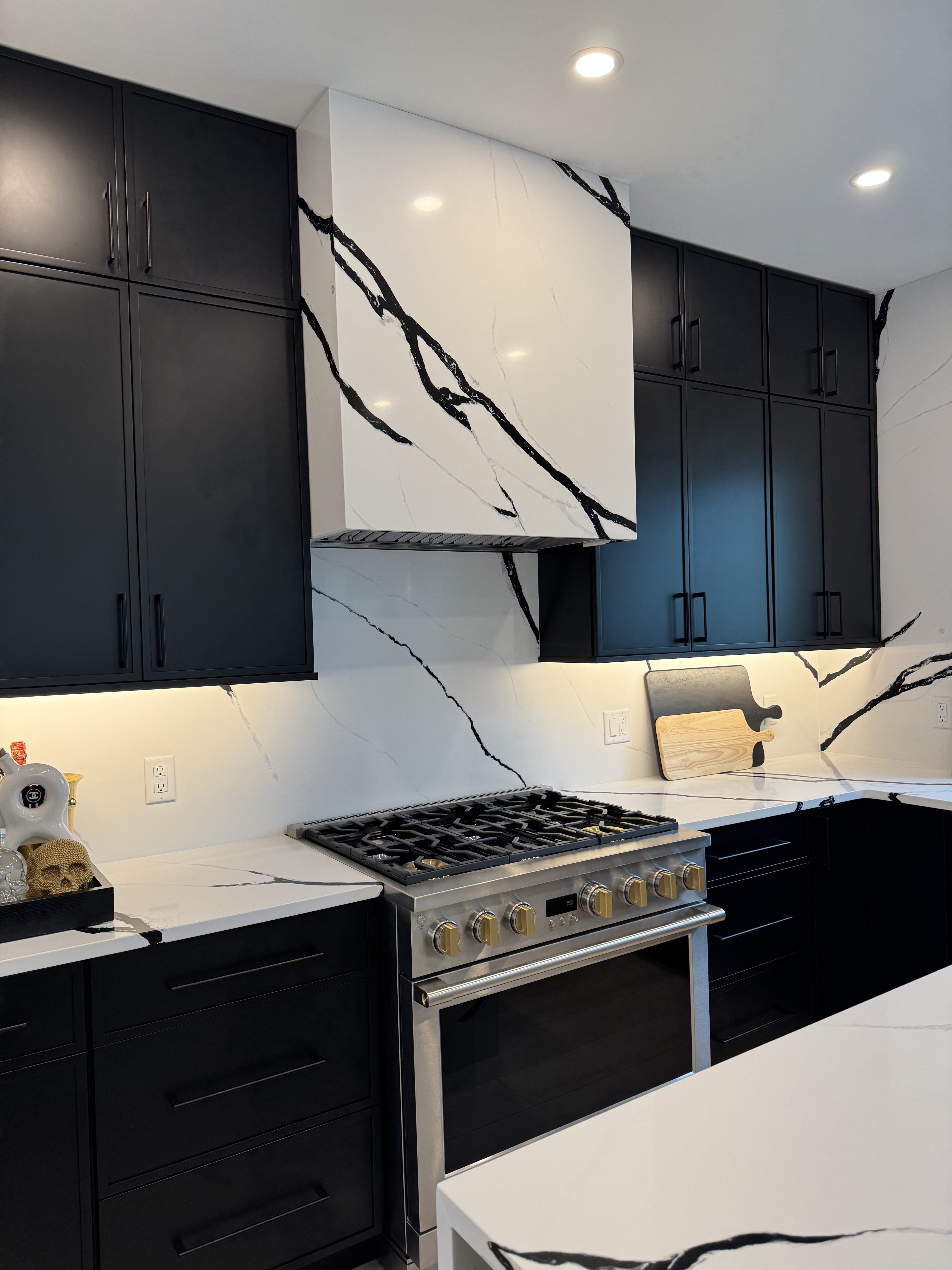 This project features 48 square feet of MSI Calacatta Lumanyx quartz, finished with an eased, polished edge and mitered drop legs for a seamless, high-end detail. The material’s crisp white surface and bold veining create a dynamic contrast that pairs beautifully with modern kitchen designs. A full mitered quartz hood and polished surfaces highlight both the craftsmanship and durability of this premium stone. With its low-maintenance performance and eye-catching style, Calacatta Lumanyx is the perfect balance of function and luxury—truly a show-stopping choice for any kitchen remodel.
