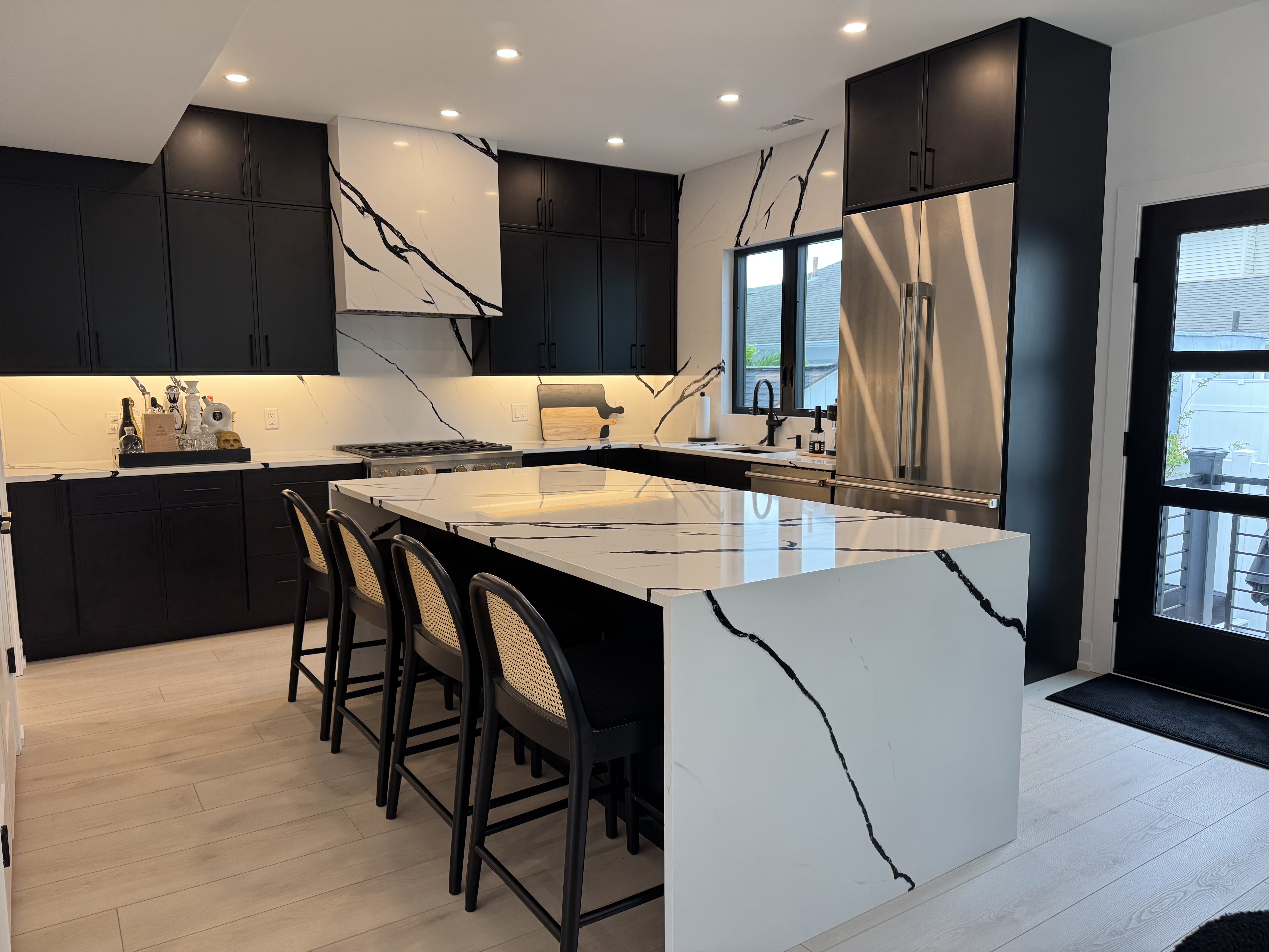 The customer completely renovated her kitchen to create a brighter, more modern space and chose MSI Calacatta Lumanyx quartz to achieve that vision. With its bold white background and dramatic black veining, this quartz instantly became the centerpiece of the design. The addition of a unique mitered hood made from the same material elevated the project into a true showpiece. The result is a kitchen that feels sleek, open, and undeniably stylish—a renovation that blends practicality with a striking contemporary look.